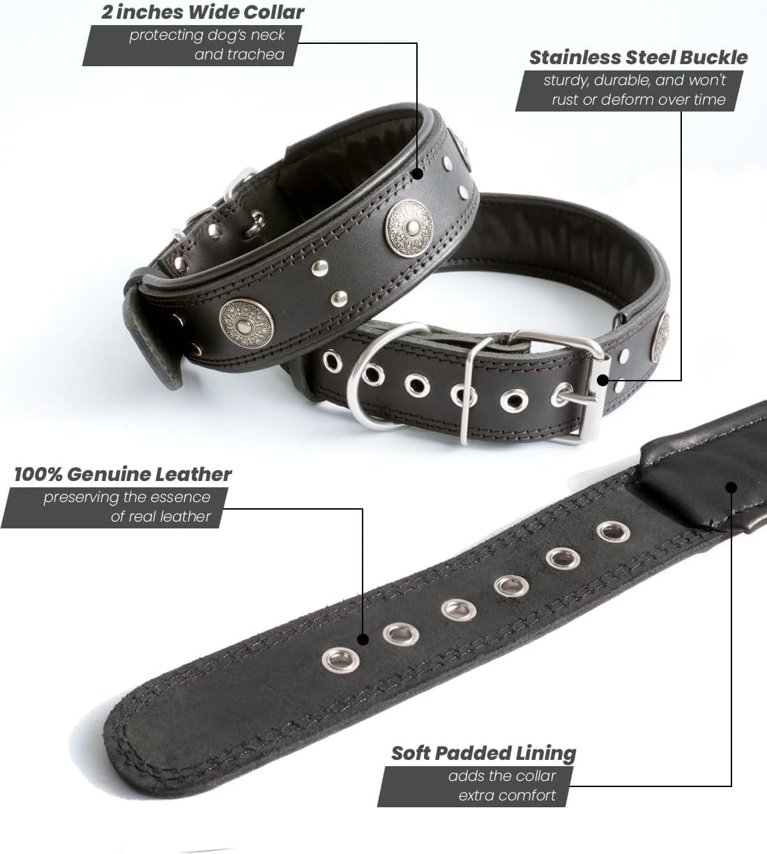 Leather Dog Collar, 2 inches Wide Heavy Duty Genuine Leather Collars, Handmade, Soft, and Luxury, Eye-catching Best Choice for Large and Medium Breed Dogs, Black 18.5-22.5 inches