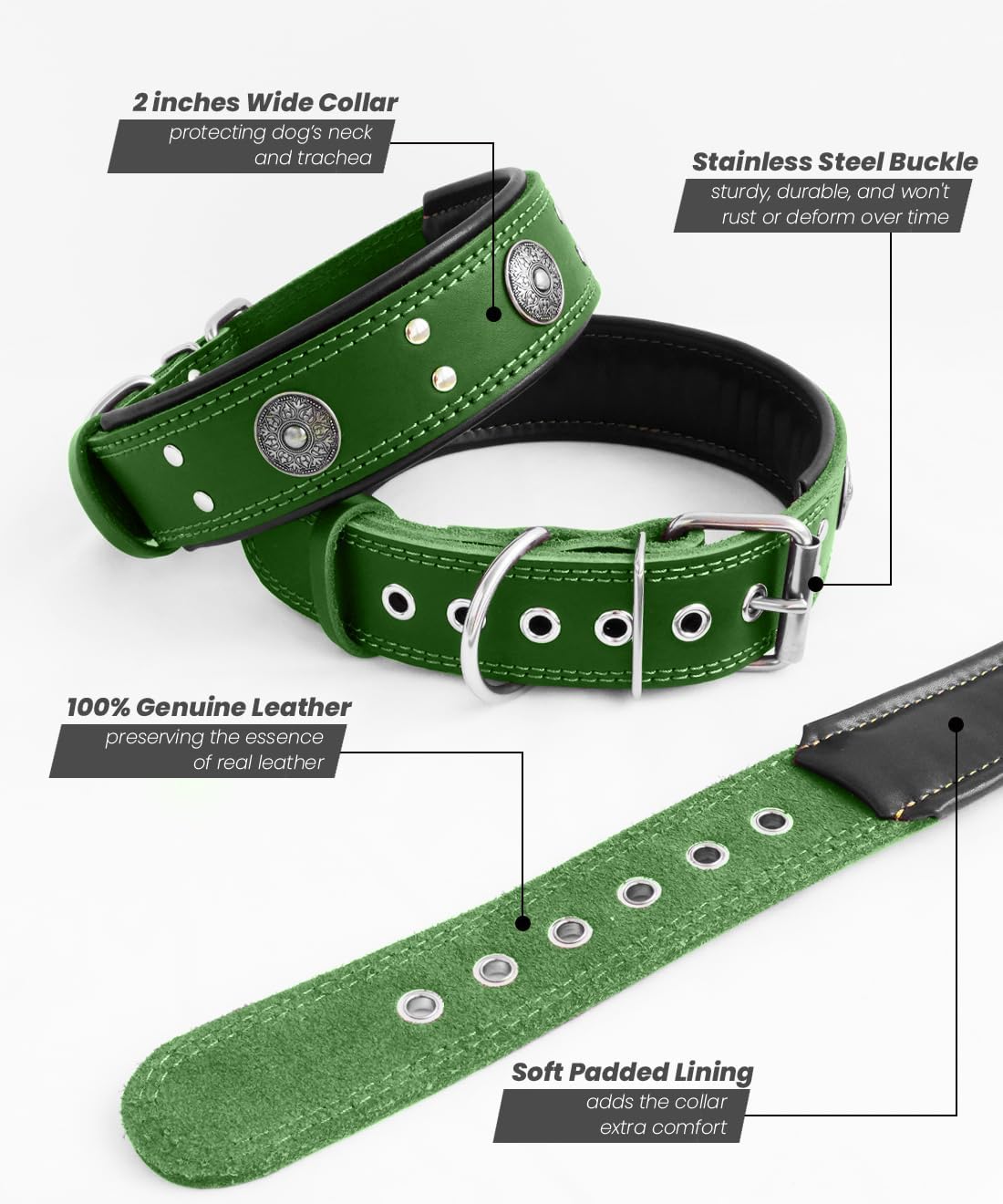 Leather Dog Collar, 2 inches Wide Heavy Duty Genuine Leather Collars, Handmade, Soft, and Luxury, Eye-catching Best Choice for Large and Medium Breed Dogs, Green 18.5-22.5 in
